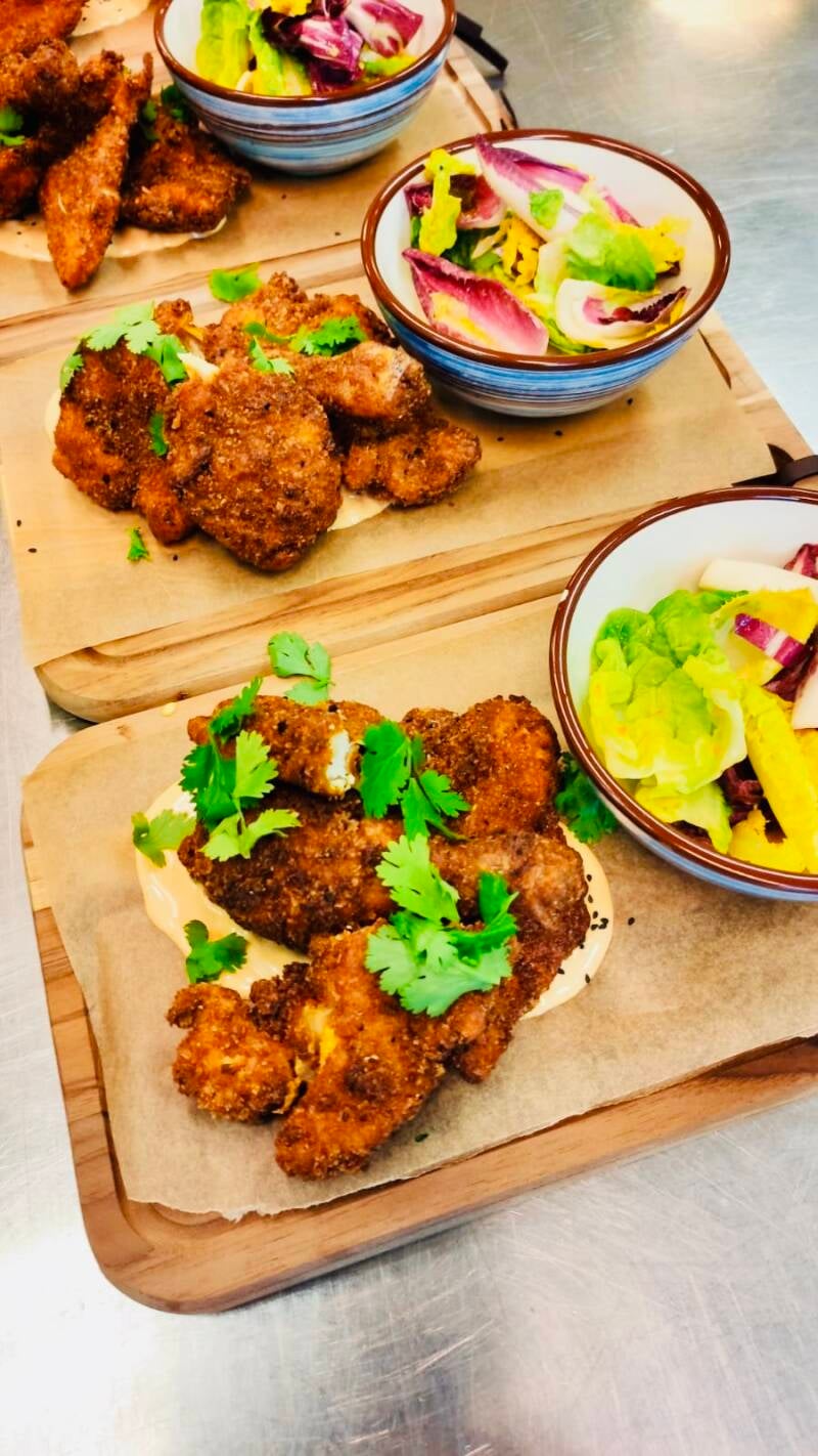 • Remove the chicken from the marinade and cook in batches until browned and cooked through (about 5-7 minutes per side). Alternatively, you can bake the chicken at 400°F (200°C) for 20-25 minutes. Set the cooked chicken aside.